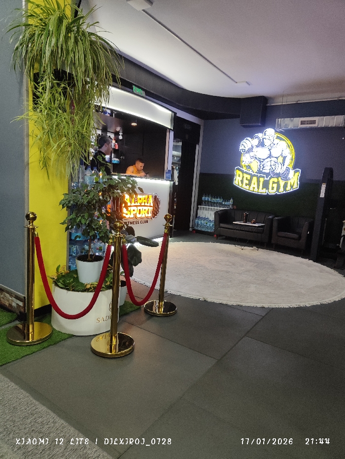 n interior view of a gym. A front desk with a sign that says "Alpha Sport Fitness Club" is visible, with two people behind it. A velvet rope queue barrier is positioned in front. A neon sign that says "Real Gym" with a bodybuilder graphic is displayed on the back wall. There are two black couches and some water bottles on a shelf. A large white rug covers part of the floor.