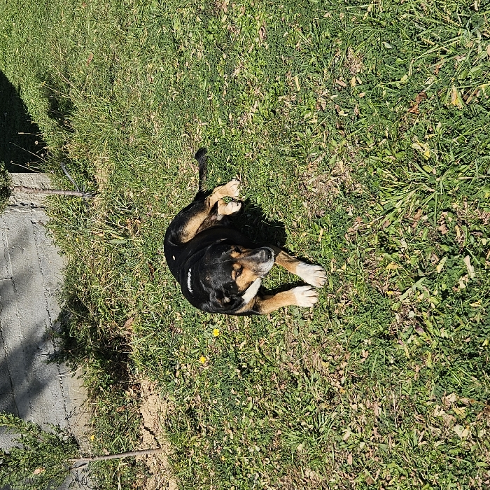The scene is set outdoors in Buriani, Georgia. The primary subject is a medium-sized dog, predominantly black with tan markings on its muzzle, eyebrows, chest, and hind legs, and white fur on all four paws. A light-colored, patterned collar is visible around the dog's neck. The dog is lying prone on a patch of green grass, facing generally towards the right side of the frame, with its head slightly lowered and eyes partially closed or downcast, indicating a state of rest. Its front paws are extended forward, while its hind legs are tucked beneath its body. The grassy ground contains scattered small yellow flowers, identifiable as dandelions, and some brown patches. In the upper left background, a light grey concrete block wall is visible, partially obscured by shadow. Two slender, young evergreen saplings stand near the wall, one to the far left and another closer to the center. The environment is illuminated by strong sunlight, casting distinct shadows. No human subjects are present.