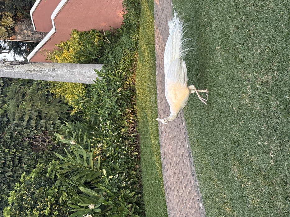 - "A white peacock stands on a textured stone path bordered by green grass on one side and lush green vegetation on the other" by FM-TOclH2, licensed under CC BY 4.0