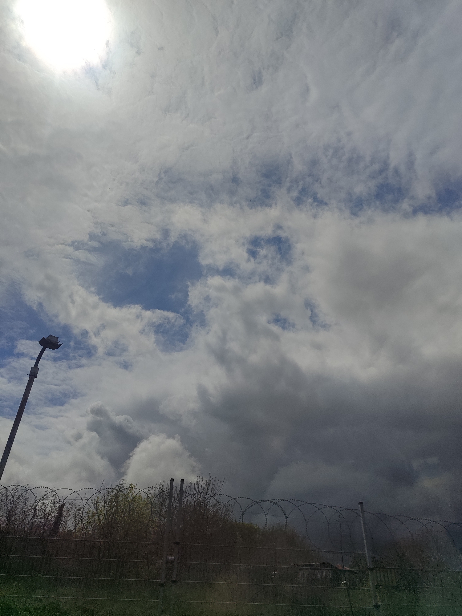 The image presents a view towards the sky in Tsarevo, Bulgaria. A street lamp stands on the left. Below, a fence with barbed wire is visible, behind which are bushes and grass. The sky is filled with clouds, and the sun is partially visible behind them. The clouds range from light and white to dark and stormy.