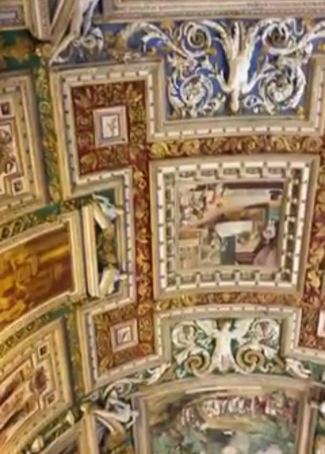 detailed, decorative ceiling. It is comprised of numerous square or rectangular panels with painted images. The panels are surrounded by elaborate golden trim, ornate carvings, and touches of red, green, and blue. Many of the panels contain detailed paintings depicting people and scenes. Small figures and decorative elements are carved between the panels. The camera pans slightly across the ceiling.