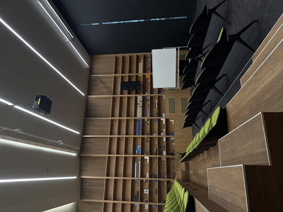 This image captures an empty, modern tiered lecture hall or multi-functional event space, identified as being within the Incubator building of Sofia Tech Park in Sofia, Bulgaria. The room is brightly illuminated by multiple parallel linear LED light fixtures integrated into a light grey perforated acoustic panel ceiling. A black video projector is suspended from the ceiling. The rear wall features an extensive, floor-to-ceiling shelving unit made of light-toned wood, containing numerous compartments largely filled with books and periodicals. Above this main shelving, vertical wooden slats extend to the ceiling. A large, black loudspeaker is mounted on the wall above and to the left of the front display area. Seating is arranged on tiered levels. On the left side of the room, a series of wooden steps lead up to individual, modern chairs, each with a prominent lime-green upholstered cushion and black base. A dark-colored bag rests on one of these chairs. On the right side, a tiered dark grey carpeted floor supports multiple rows of black chairs, each equipped with a lime-green seat cushion and angular black legs, all oriented towards the front of the room. A white mobile whiteboard on a stand is positioned on the dark grey carpet in the front-right section of the room. The rightmost visible wall is dark-colored, likely black, with a narrow, vertical strip of light along its far right edge. No individuals are present within the scene.