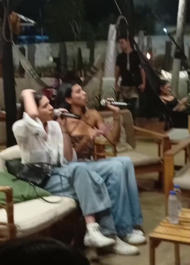 Two people sit on a cushioned couch under a covered outdoor structure and sing into microphones. The person on the left has long dark hair, fair skin, and wears a white top and jeans. The person on the right has long dark hair, tan skin, and wears a patterned top and jeans. They both hold microphones and appear to be performing. Other people sit in the background on various pieces of outdoor furniture, including a hammock. A man in a black t-shirt walks behind the two performers. The setting appears to be a relaxed outdoor bar or restaurant at night, with ambient lighting and decorative elements.