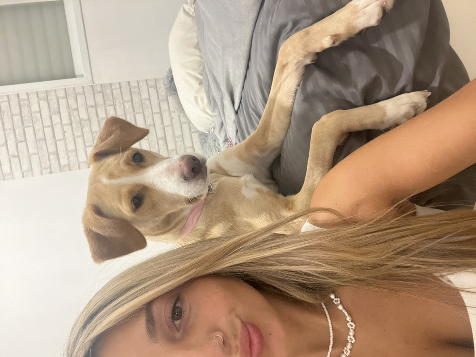 This indoor image, captured in Ramat Gan, Israel, features a female individual and a dog within a domestic setting. The female's right profile, including a portion of her face with a small silver nose ring, long blonde hair, and shoulder, is visible on the left side of the frame, indicating a selfie perspective. She is wearing a white top and two layered necklaces, one a delicate beaded strand and the other composed of small white floral-shaped beads. To her right, a tan and white dog with floppy ears and a pink collar is positioned on a bed covered with dark gray striped sheets. The dog faces the camera directly, with its front legs extended forward on the bedding. Its fur is predominantly tan, with white markings on its snout, chest, and lower legs. The background consists of a plain light-colored wall, transitioning to a section of white brick-patterned wallpaper or textured surface on the right side. A window with a closed horizontal blind is visible in the upper right corner of the frame. A light-colored pillow rests on the bed behind the dog.