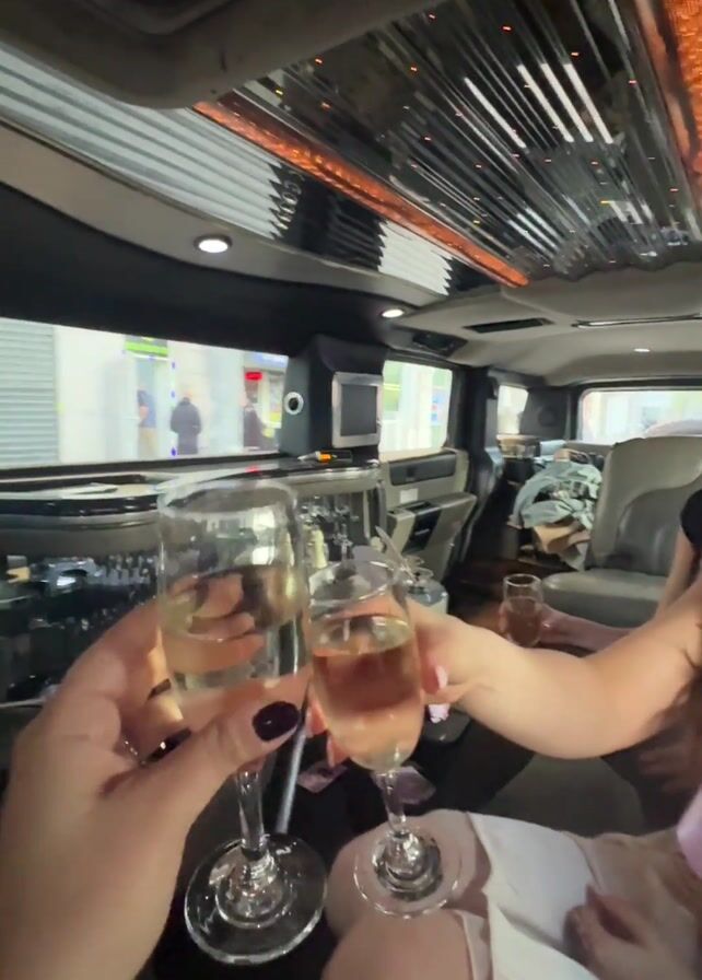 Inside a limousine, several women are celebrating, holding champagne glasses and toasting