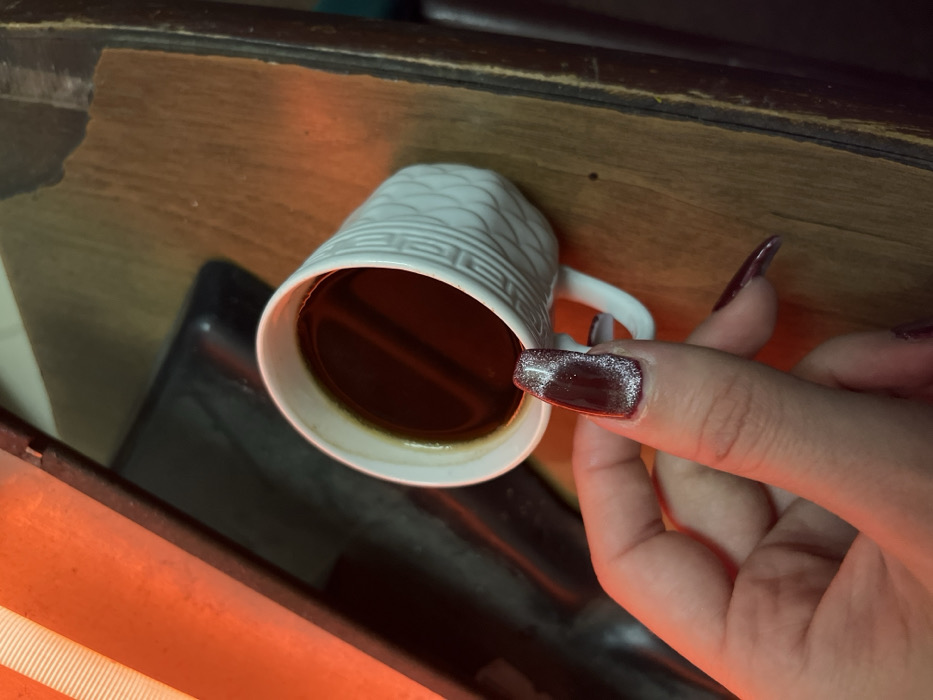 A white, patterned mug filled with a dark liquid, presumably coffee, sits on a wooden surface next to a black rectangular object. A hand, with long, dark red and glittery nails, reaches towards the mug. The scene is illuminated by an orange glow. The wooden surface appears to be a part of furniture, with a visible border.
