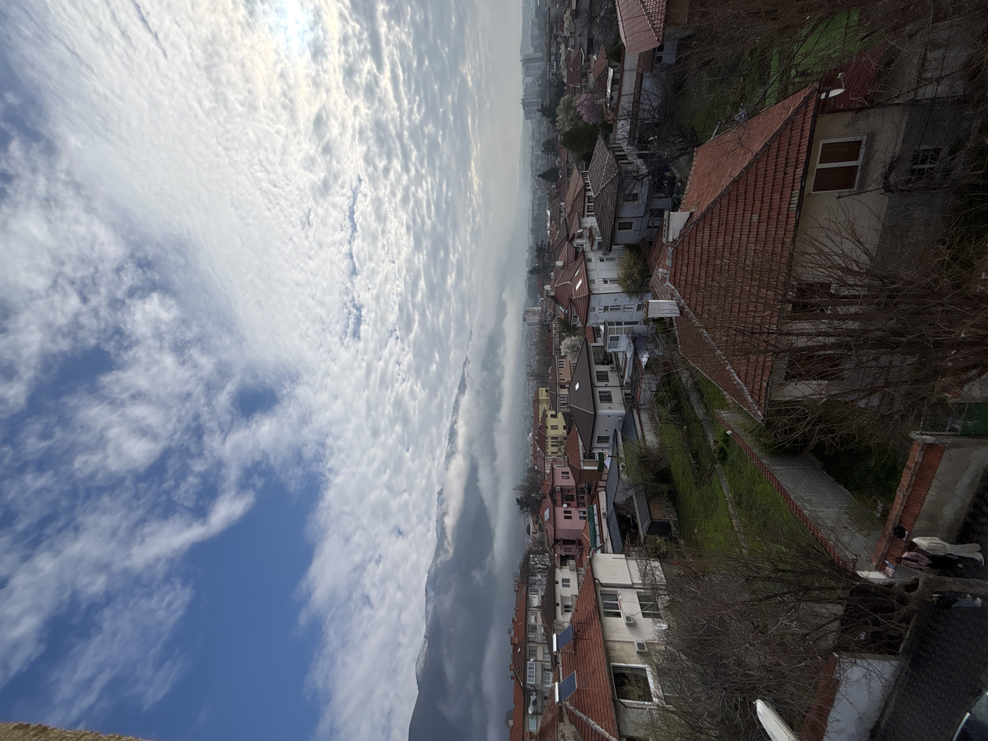 cityscape, possibly in Karlovo, Bulgaria, based on architectural cues and surrounding landscape. The view is elevated, looking down upon residential buildings with red-tiled roofs. In the background, there's a mountain partially obscured by fog or low-lying clouds, with more buildings stretching into the distance. The sky is partly cloudy with blue patches. Two people can be seen at the bottom right near a brick fence.