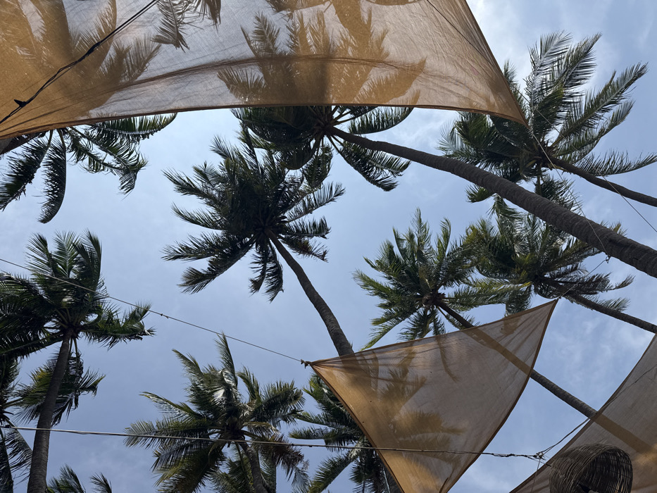 An upward-angled view captures a clear light blue sky with sparse, wispy white clouds over Thành phố Phan Thiết, Vietnam. Numerous tall coconut palm trees with green fronds and visible brown trunks extend into the frame from the lower and side edges. Several light brown, translucent fabric shade sails are suspended overhead, partially obscuring the sky and some palm fronds. One triangular fabric panel occupies the mid-left, while a larger, irregular panel extends along the right side. Thin, dark lines or cables are visible, supporting these fabric structures. Shadows of palm fronds are distinctly cast upon the fabric panel on the right. In the bottom-left corner, a small section of a dark, woven cylindrical object hangs below one of the fabric panels. No individuals are present.