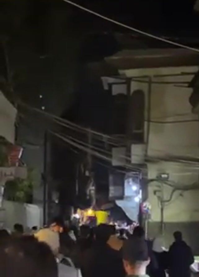 street scene at night, likely in an urban area. A crowd of people is visible, primarily seen from the back. The architecture appears to be older, with buildings close together and a variety of windows and doors. There are overhead wires crisscrossing the street. Lighting is provided by street lamps and some illuminated signs. Some people are wearing hooded clothing. The overall impression is of a crowded street with pedestrians.