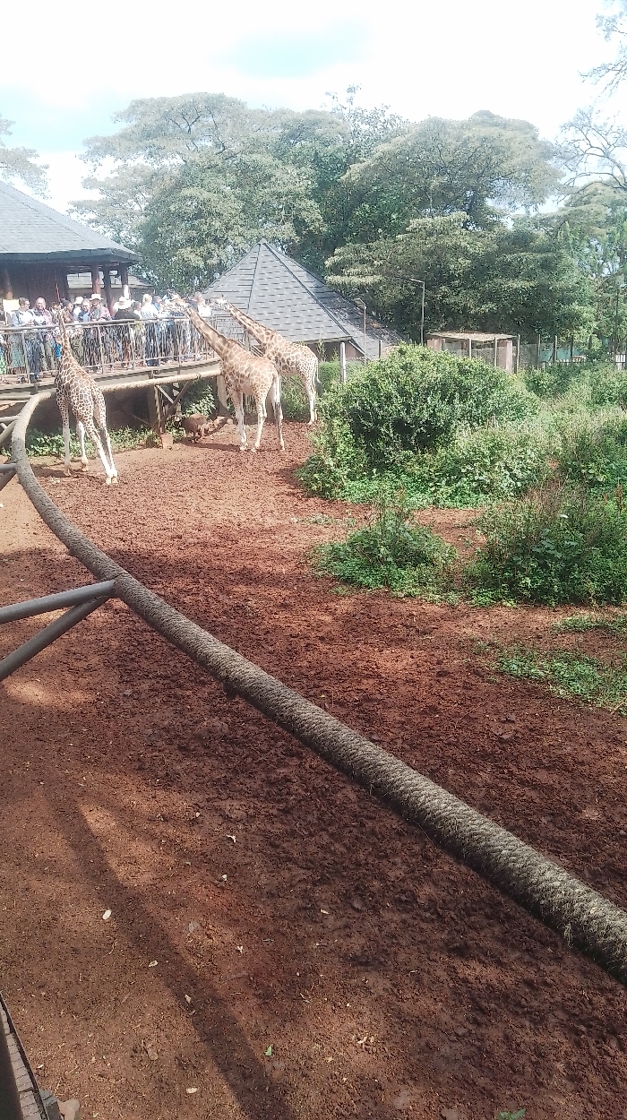 The image depicts an outdoor scene at the Giraffe Centre in Nairobi, Kenya