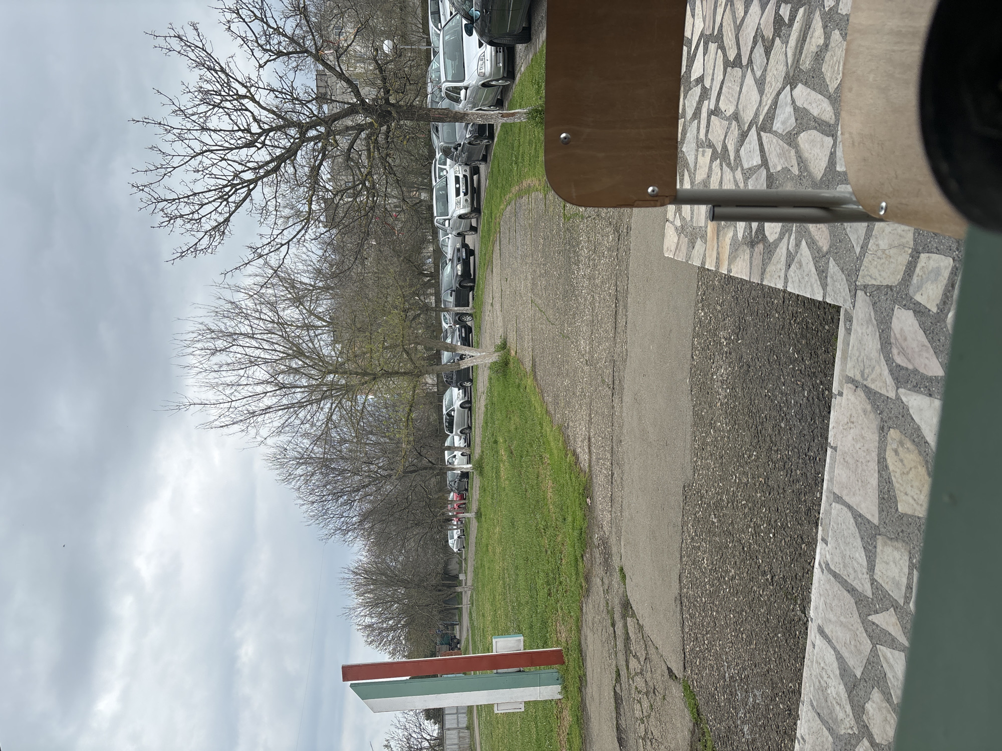 street scene in Harmanli, Bulgaria. A line of parked cars stretches along the side of a road, bordered by bare trees. A grassy strip separates the parked cars and the road. In the foreground, there is a stone-tiled surface and a metal structure. The sky is overcast. A sign with red and green stripes is visible in the distance. There are no people visible.