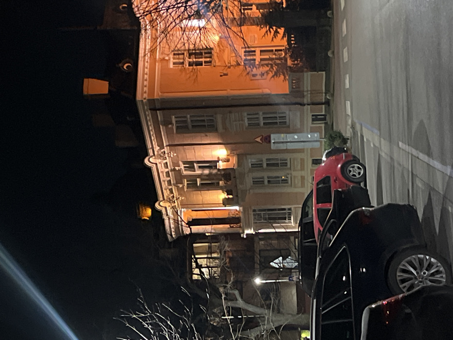 The image depicts a nighttime urban scene in Sliven, Bulgaria, specifically showing the facade of the District Court of Sliven, located at "Dimitris Periklis" 1. The central subject is a multi-story building, illuminated with warm, yellowish-orange lights, highlighting its classical architectural features. These features include columns, decorative moldings, and a prominent bay window or balcony structure on the second floor. The building's facade appears to be a light, possibly beige or peach, hue. Several windows are visible, and the roofline features chimneys and decorative elements. To the left and slightly behind this main building, a darker, less illuminated building with visible windows and interior lighting is present. Bare tree branches are visible in front of this darker building. In the foreground, a series of parked vehicles occupy marked parking spaces on an asphalt surface. The closest visible vehicle on the left is a dark-colored station wagon, showing a portion of its rear wheel and bodywork. Behind it, a red two-door hatchback (identifiable as a Volkswagen Golf) is parked, facing left. Further behind the red car, a dark SUV or larger sedan is visible. A vertical street sign pole is positioned between the parked cars and the illuminated building. The sky is dark and clear, indicating nighttime conditions. A distinct bright light streak or reflection extends diagonally from the upper left corner of the frame. Streetlights are visible in the background, contributing to the artificial illumination of the scene. No individuals are discernible within the frame. The overall impression is one of a quiet, illuminated street scene in an urban environment.
