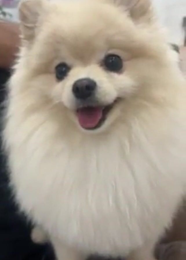 A white Pomeranian dog looks at the camera with its tongue sticking out, while a faint voice speaks in the background