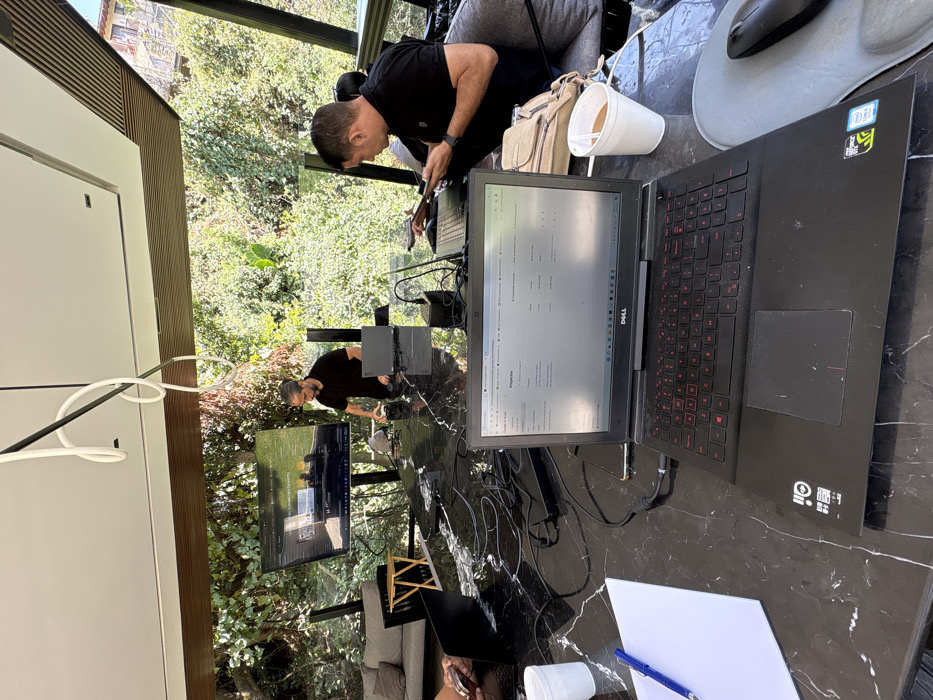 The image depicts an outdoor or semi-outdoor workspace in Tetela Del Monte, Mexico, characterized by a modern architectural design featuring a white ceiling, exposed wooden slats, glass panels, and a large black marble table. The scene is set against a backdrop of dense green foliage, with a distant building partially visible through the trees. Three individuals are present: a male with dark hair and a beard, wearing a black polo shirt, stands centrally, adjusting a camera or similar device on the table while facing a large monitor displaying a graphical interface. To his right, another male with dark hair, also in a black polo shirt, is seated, actively viewing and interacting with a tablet he holds with both hands. A light-colored messenger bag rests beside him on a gray cushioned chair. A third person's arm and hand are visible on the far left, holding a smartphone, suggesting their presence at the table. The black marble table is cluttered with multiple electronic devices, including at least four laptops (one black Dell laptop prominent in the foreground displaying a "Proyectos" interface, another silver laptop near the standing man, and two dark laptops on either side), power adapters, and numerous black cables. A white styrofoam cup containing a brown liquid, a white plastic cup, a blue pen, and a blank piece of paper are also on the table. The overall impression is a collaborative digital work session integrated with a natural environment.