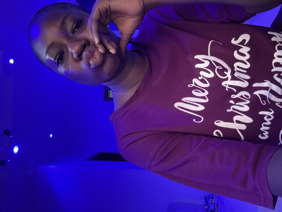 A woman with dark hair and skin, wearing a maroon shirt with "Merry Christmas and Happy" in white font, is posed with puckered lips and a hand near her face. The lighting is blue, creating a cool ambiance. Light fixtures are visible in the background. The photo appears to be taken at a tilted angle.
