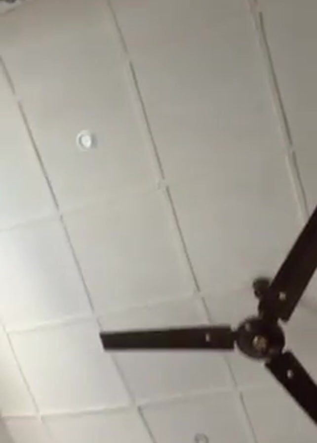 stationary ceiling fan with three dark brown blades in a room with a white ceiling and walls. The ceiling is decorated with a grid pattern and has recessed lights. A window with a curtain rod is visible near the bottom of the frame. The camera slowly zooms out and tilts slightly.