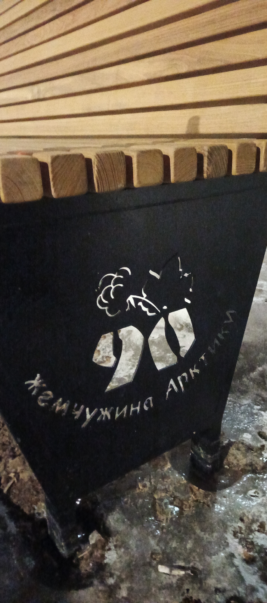 detail of a bench located in Nar'yan-Mar, Russia. The bench has a wooden seat made of evenly spaced planks. The side panel of the bench is black and features a cutout design. This design includes a stylized image resembling a flower or firework, flanked by the silver Cyrillic text "Жемчужина Арктики" ("Pearl of the Arctic"). The ground around the bench is dirty and possibly wet.