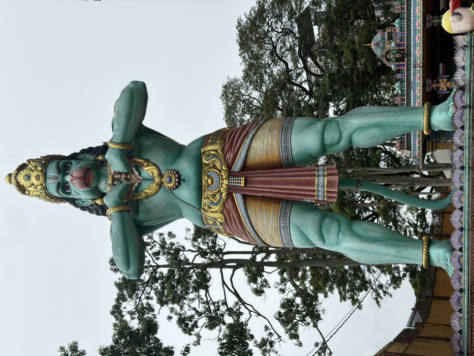A large, green statue of Hanuman stands against a backdrop of trees and a cloudy sky