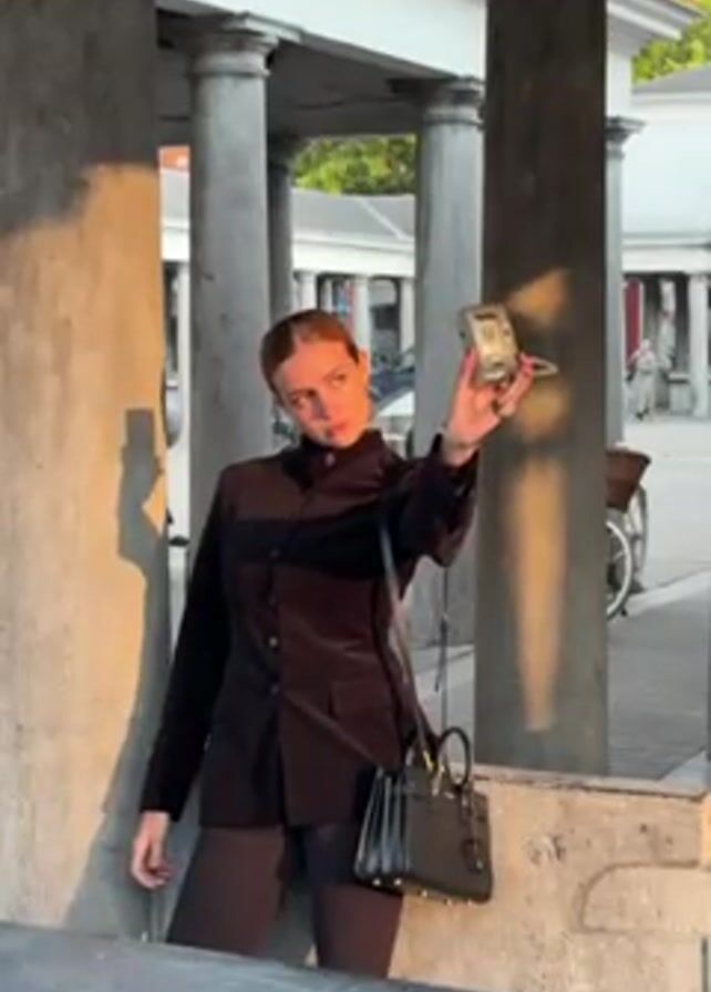 A woman in a dark suit takes a selfie with a small, boxy camera, possibly a film camera. She is standing in a portico-like structure, with concrete columns. Light falls in stripes on the columns and walls. A black purse hangs at her side. Outside the portico is a plaza with trees, buildings, people and a bicycle.