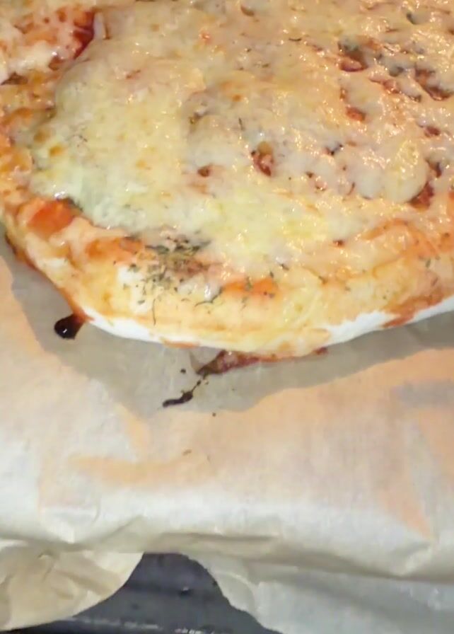 close-up of a freshly baked pizza sitting on parchment paper. The pizza is round with a thick crust and is covered with a generous layer of melted cheese. The cheese has a slightly golden color and is bubbly in some areas. Beneath the cheese, there is a visible red sauce and what appears to be other toppings scattered across the pizza. The pizza sits on a sheet of brown parchment paper which is wrinkled. The edges of the parchment paper are visible, showing some browning and minor staining, likely from baking. The parchment paper sits on a dark surface, possibly a baking sheet or oven rack. The camera zooms in to reveal more detail. In the background, muffled voices are heard, suggesting that people are present in the environment.