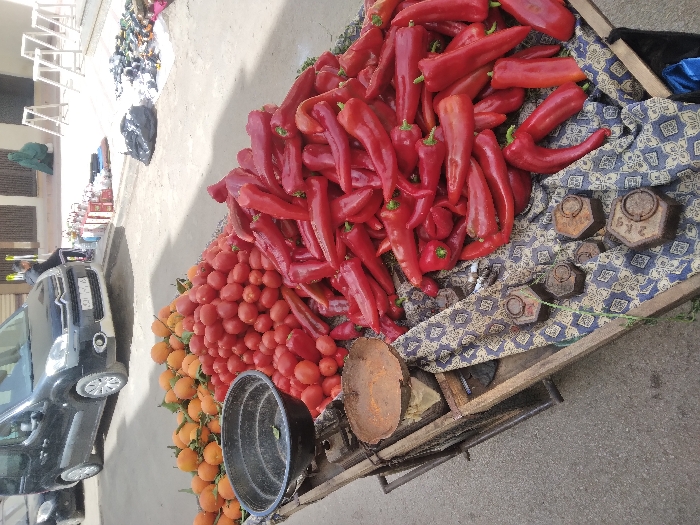 This image depicts an outdoor market scene in the city of Meknes, Morocco. In the foreground, a wooden vendor's cart is prominently featured, laden with fresh produce. On the left, a large pile of oranges is visible, some retaining green leaves. Adjacent to the oranges, a mound of red tomatoes is stacked. Dominating the right side of the cart is a substantial pile of vibrant red pointed peppers. A black plastic basin is situated among the tomatoes. Below the produce, a manual scale with a rusty, circular pan and multiple hexagonal metal weights is displayed on a blue and white patterned cloth covering part of the cart. In the midground, a black Citroën Berlingo van is parked on a paved street. To the right of the van, various market goods are laid out on the ground. A partially obscured person in a dark garment is visible behind the van. Further to the right, an individual wearing a green abaya is seated or squatting on the pavement, surrounded by more merchandise. The background consists of a building with a barred window and several white, foldable display stands. The ground throughout the scene is paved.