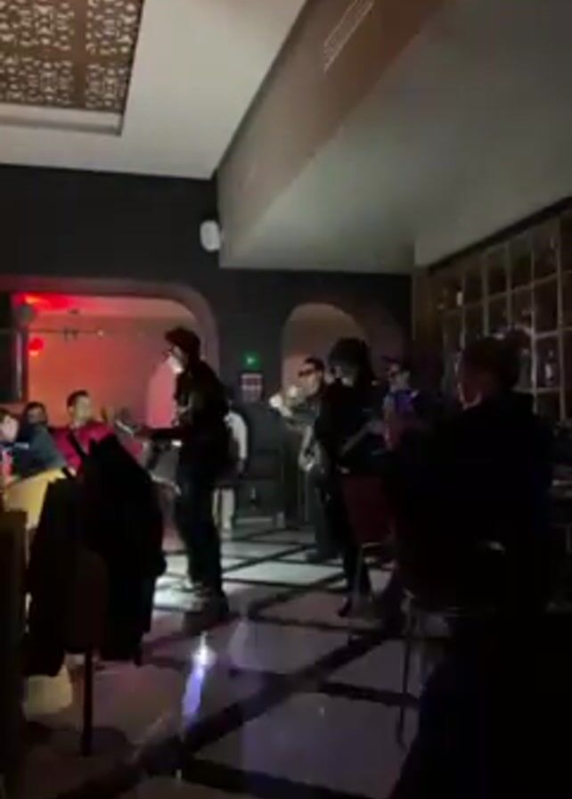In a dimly lit restaurant, a band of three plays for seated patrons. The band members are wearing dark outfits and sunglasses, giving off a theatrical vibe. The lead performer moves expressively, engaging with the music, while the other two stand behind him. Diners watch and record with their phones. The restaurant has modern decor with a patterned ceiling and dark walls, illuminated by red lighting in the background. The floor is tiled with shiny, dark rectangles.