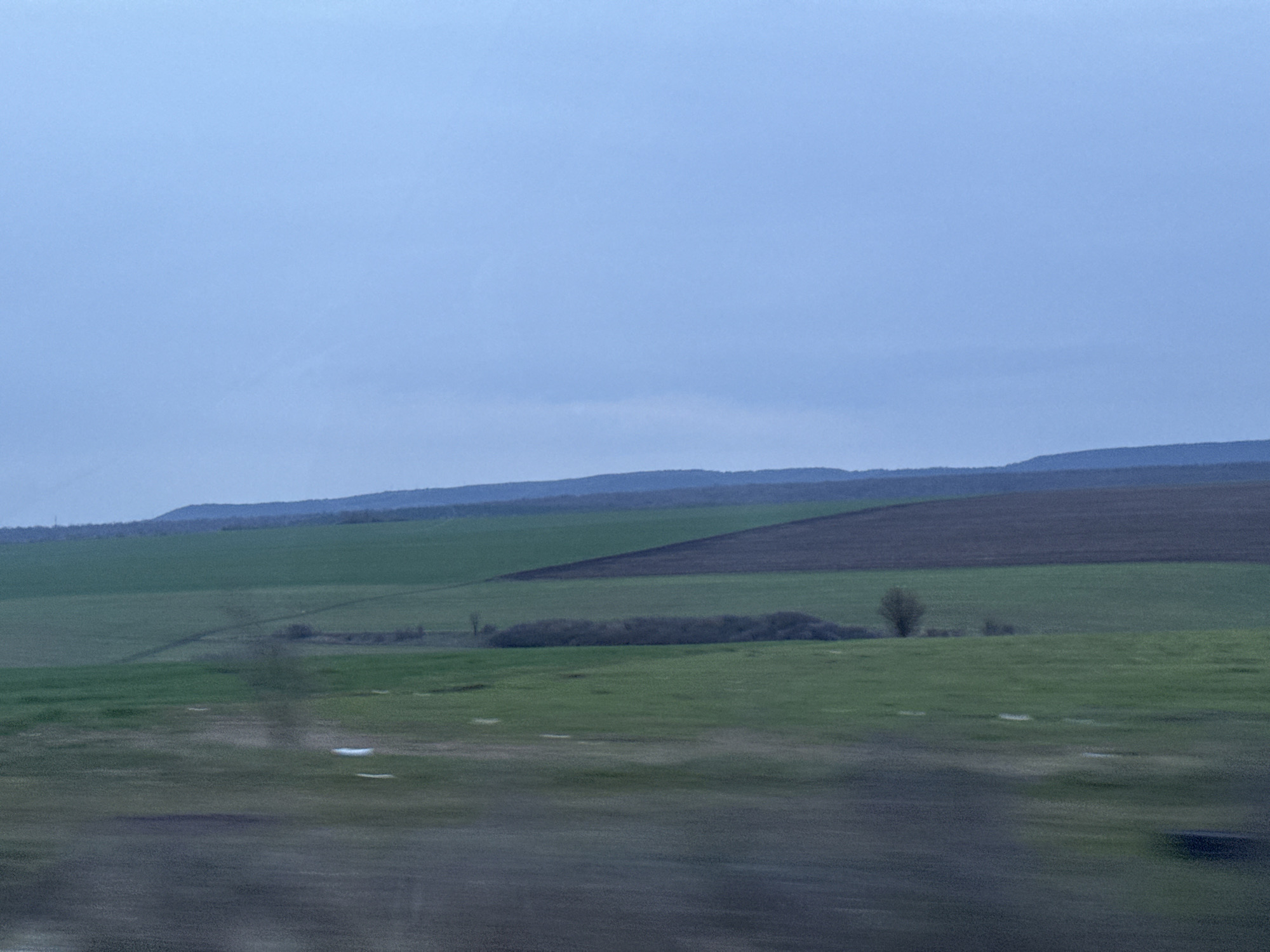 The scene captures a rural landscape near Struino, Bulgaria, under an overcast, light blue-grey sky. A distant range of dark, undulating hills, likely covered in sparse vegetation or dormant trees, forms the horizon line. The mid-ground is dominated by agricultural fields, presenting a mosaic of green cultivated areas and a distinct, dark brown, triangular patch of tilled earth on the right. A linear formation of dense, dormant bushes or small trees is situated in the mid-ground, slightly left of center, with a single, bare deciduous tree positioned to its right. The immediate foreground consists of blurred, dark green-brown ground, exhibiting several irregular white patches consistent with residual snow or frost. No individuals, animals, or explicit actions are present within the frame. The overall image displays motion blur, particularly in the foreground, indicating it was captured from a moving perspective.