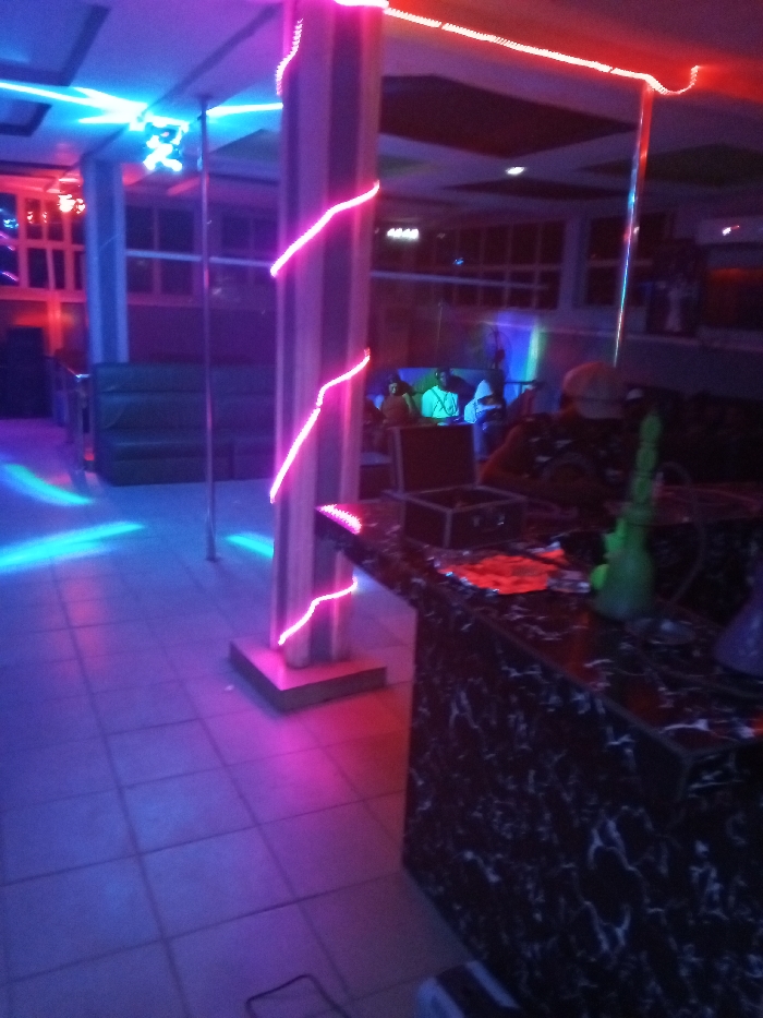 The dimly lit interior features a dance pole under blue light, a pink-lit pillar, and a patterned bar