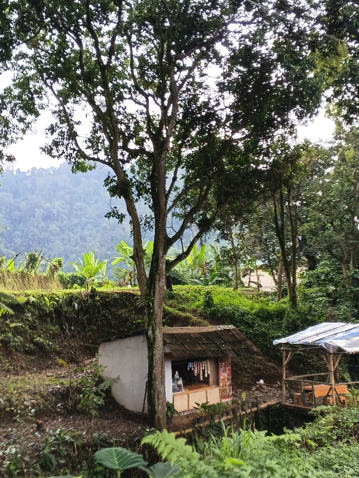 A lush, verdant scene showcases a small roadside shop nestled into a hillside. The shop, white with a dark roof, displays colorful snacks and drinks. A wooden gazebo with seating is connected by a narrow bridge. Towering trees and thick vegetation frame the view, with a distant mountain visible in the background. Banana trees add a tropical touch to the landscape. Ferns and other plants fill the foreground, creating a sense of depth and immersion in nature.