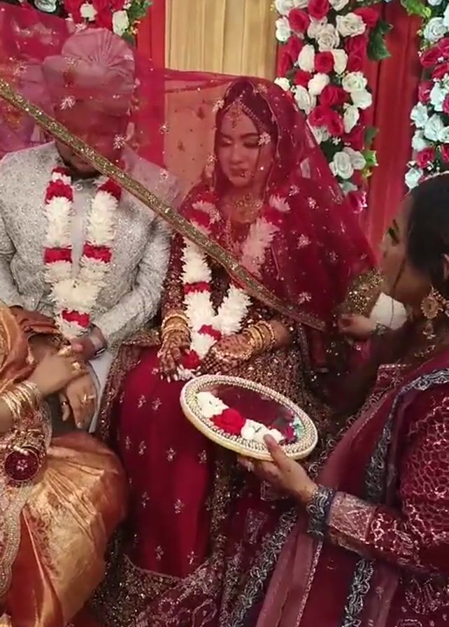 The video depicts a wedding scene where the bride and groom are seated on chairs, adorned with garlands, in front of a backdrop of red and white roses. The bride is wearing a red dress and veil, while the groom is in a silver suit and turban. Two women, dressed in traditional attire, are attending to them; one is holding a decorative plate with flower petals. People can be seen in the background, and a camera is positioned to capture the event. The general atmosphere suggests a traditional wedding celebration.