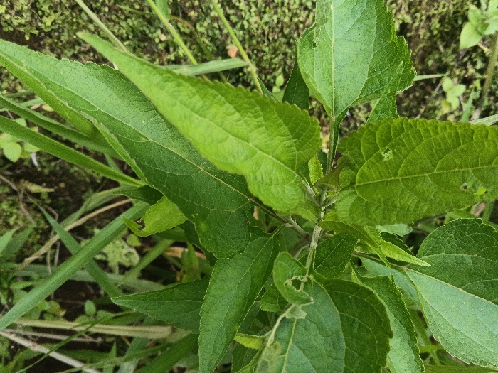 This close-up, high-angle image depicts dense green foliage within a natural outdoor environment in Khna, Cambodia. The central subject is a herbaceous plant characterized by multiple, ovate to lanceolate leaves, displaying a range of medium to dark green hues. Visible features include distinct reticulate venation and irregularly serrated or undulate margins. Some leaves exhibit minor surface imperfections or small perforations, consistent with natural wear or insect activity. Lighter green grass blades and other unidentifiable blurred plant matter are present in the foreground and background, indicating an overgrown or wild setting. No human subjects, man-made objects, or specific geographical markers beyond the foliage are visible.