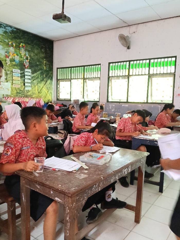 Inside a bright classroom, students in red and white uniforms are seated at wooden desks, focused on their work. Sunlight streams through barred windows. The walls are decorated with colorful murals and a ceiling fan. A projector hangs from the ceiling. The students are writing on paper. Some have clear water glasses and pencil cases on their desks. The atmosphere is quiet and studious.