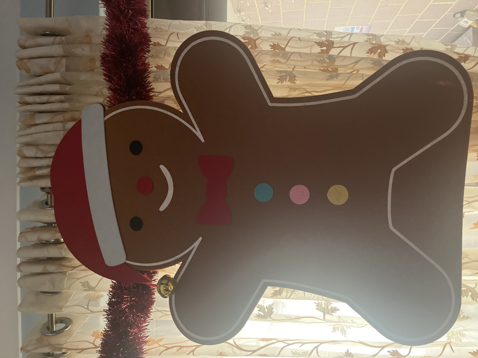 - "A sideways, cartoon gingerbread man cutout hangs in front of a window covered by tan blinds" by FM-YFYOS2, licensed under CC BY 4.0