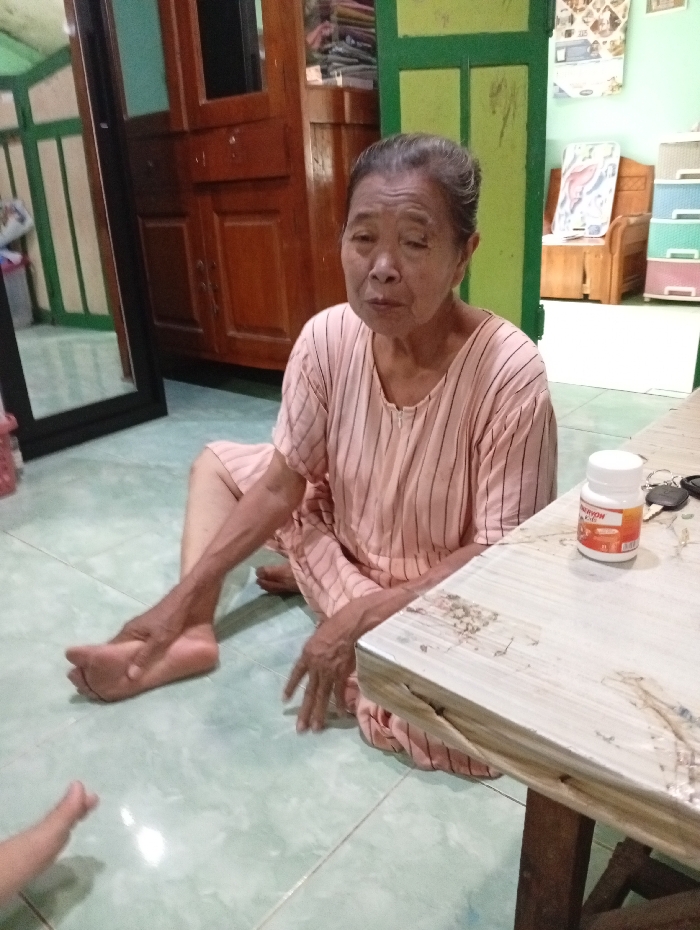 An elderly woman, with dark hair pulled back and wearing a light-colored, vertically striped garment, is seated on a light green tiled floor in a domestic setting within Kecamatan Pati, Indonesia