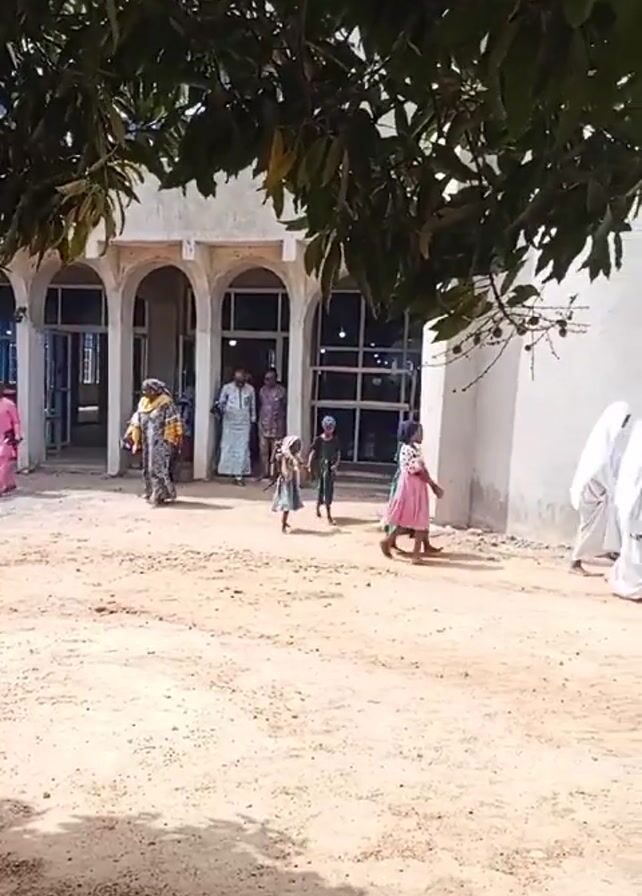 dirt courtyard in front of a building that appears to be a mosque. Several people are walking in the courtyard. A group of people dressed in white are walking toward a covered area where more people are gathered. There are children walking and running in the courtyard. The building has archways and glass doors. There is a tree providing shade in the foreground. The sky is clear and sunny. There is music playing in the background.