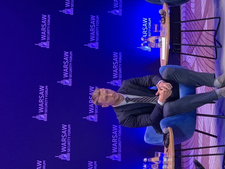 An adult male is seated on a light blue upholstered armchair, positioned on a carpeted stage or platform at a conference identified as the "Warsaw Security Forum" in Warsaw, Poland