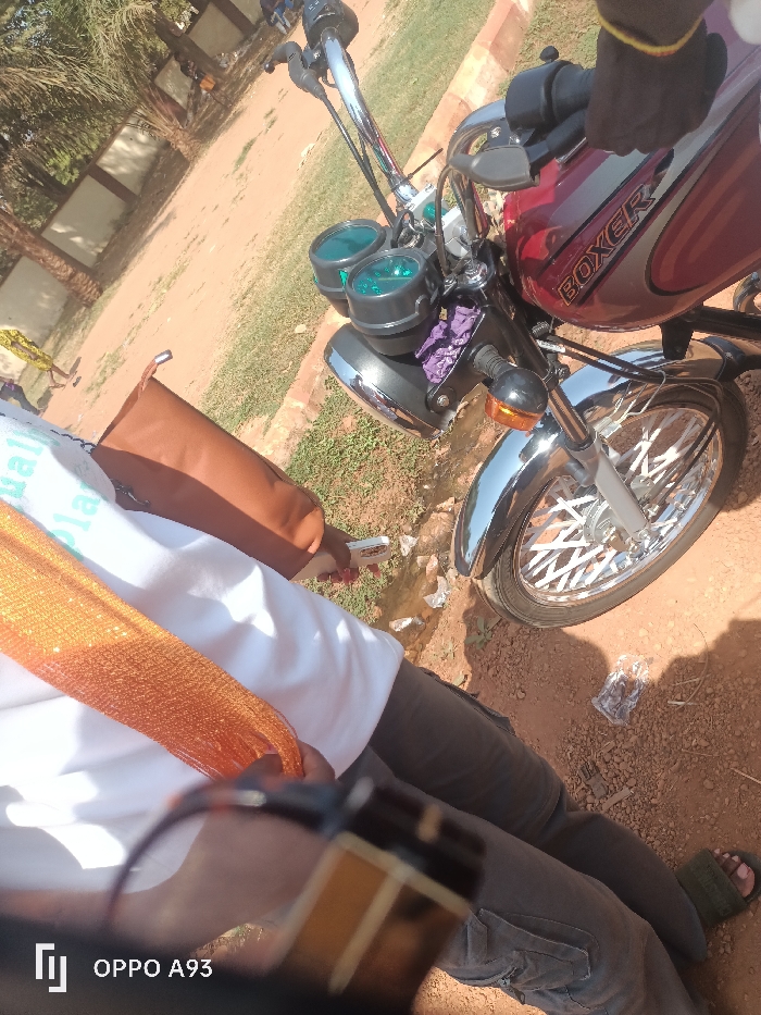 The image presents an outdoor scene in Makurdi, Nigeria, captured from a high-angle, tilted perspective. A red Bajaj Boxer motorcycle is prominently featured in the mid-right, displaying a silver "BOXER" decal on its fuel tank, chrome handlebars, front fender, and front wheel with white spokes. The motorcycle has two circular, green-tinted auxiliary lights positioned above a standard headlight, and an orange turn signal. A piece of purple fabric is tied to the motorcycle's front fork. A black glove with a yellow stripe is visible on the right handlebar grip. To the left of the motorcycle, a person is partially visible, wearing a white t-shirt with faint light blue text, dark grey cargo-style trousers, and dark green slip-on sandals on their right foot. An orange, possibly metallic or sequined, fabric is draped across their lap. The person holds a white smartphone in their right hand, and a brown bag or satchel rests on their left side. The ground consists of dry, reddish-brown earth with interspersed patches of green grass. Several pieces of white plastic litter are scattered on the ground near the motorcycle and the person's feet. In the background, a light-colored wall with a darker top is visible, behind which stand several trees, including palm-like varieties, under clear, sunny conditions. A faint yellow object or individual is discernible in the far left background.