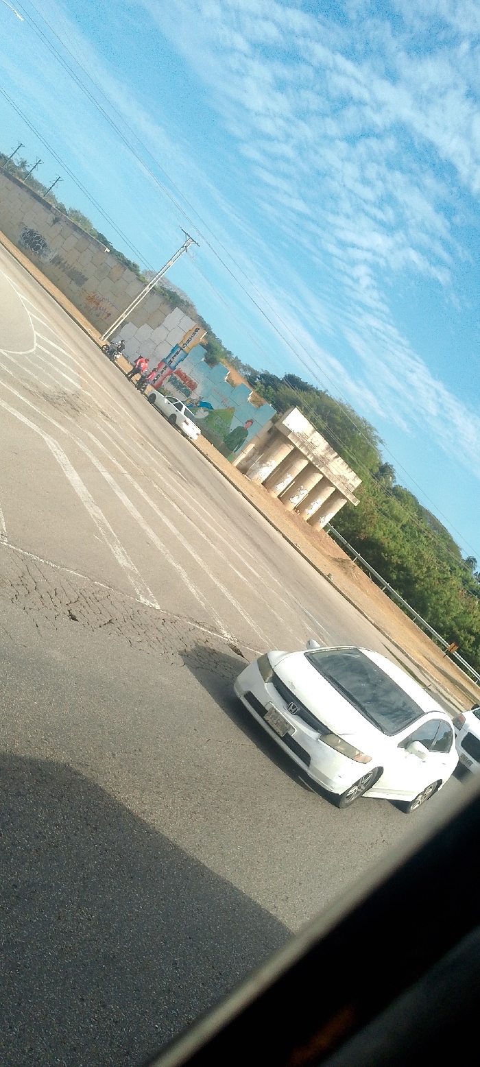 This image captures a daytime urban scene in La Asuncion, Venezuela, under a bright blue sky with scattered white clouds. The photograph is tilted to the right. The foreground shows a segment of an asphalt road with visible cracks and diagonal white markings. A white Honda Civic sedan is positioned towards the right side of the frame, facing forward, appearing to be stationary or moving slowly. Its front bumper shows minor signs of wear. Behind it, a second white sedan is partially visible. The immediate foreground also includes a dark shadow cast, possibly from the vehicle the photo was taken from. In the midground, to the left of the road, a dark-colored motorcycle is parked near a concrete retaining wall. Two individuals are standing next to the motorcycle: one wears a red shirt and dark pants, and the other wears a dark shirt. Further along the retaining wall, another light-colored sedan is visible. The retaining wall, a prominent feature, is constructed from concrete blocks. Its upper left section displays black graffiti tags. A large, colorful mural covers a significant portion of the wall, featuring vertical blue, red, and white stripes, and to its right, a depiction of a figure in a green military-style uniform. Further in the midground, to the right of the mural, a concrete structure with four large cylindrical pillars supporting a flat, rectangular slab is visible. Beyond this structure and the retaining wall, a dense hillside covered with green foliage and trees rises. Two utility poles with overhead power lines are also discernible against the sky and wall. A metal guardrail runs alongside the right edge of the road in the distance.
