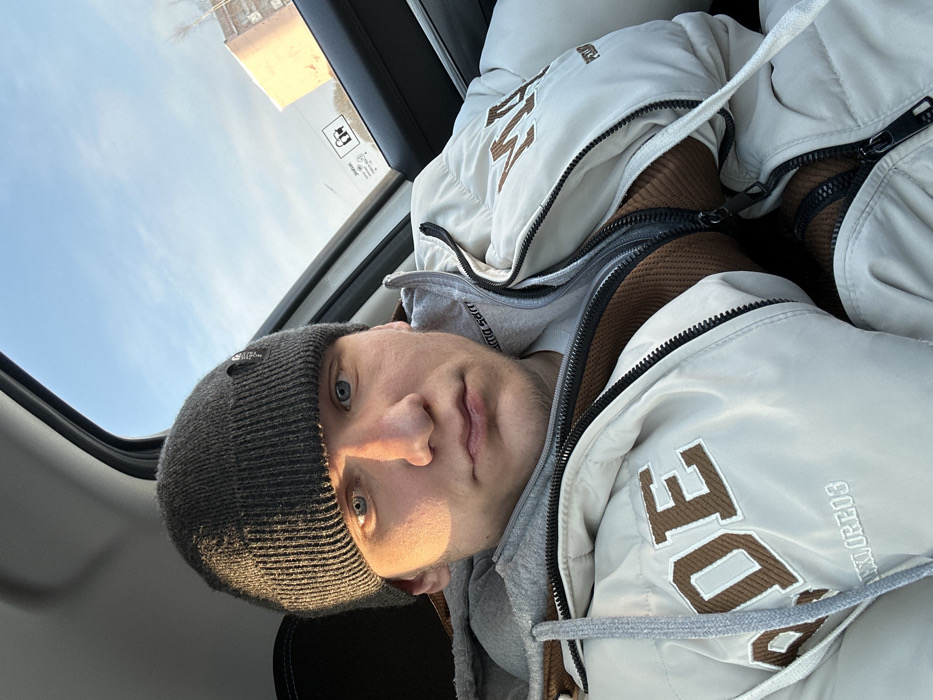 A young adult male is depicted from the chest up, seated inside a vehicle, likely in the front passenger position. He has light skin, blue eyes, and short facial hair, and is looking directly forward. He wears a dark grey ribbed knit beanie with a small dark patch on the left side, a light grey hooded sweatshirt, and an unzipped light beige puffer jacket. The jacket displays large brown block letters, including "RDE" on the left chest and "M" on the right chest, along with smaller text "PPLORE03" and "PS." A brown textured inner layer is visible beneath the jacket. Strong sunlight illuminates the right side of his face. Through the vehicle's right-side window, a clear blue sky with minimal clouds is visible above a distant, multi-story, light-colored building, possibly residential or commercial. The interior of the vehicle features dark trim, and a warning label is affixed to the window glass. This scene is located in the city of Dobryanka, Russia.
