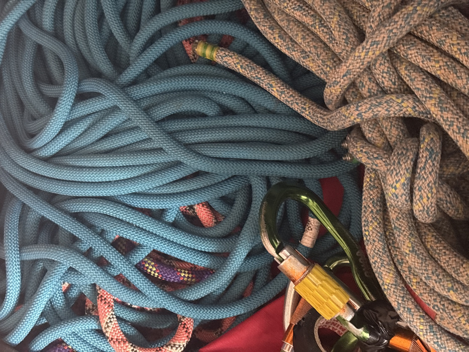 - "The image displays a close-up, overhead view of various climbing ropes and hardware" by FM-Zp3et1, licensed under CC BY 4.0