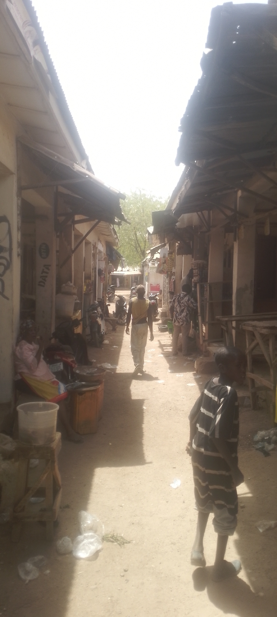 This image captures a narrow, unpaved commercial thoroughfare in the city of Katsina, Nigeria, in the vicinity of Muhammadu Dikko Stadium. The scene is brightly lit by an overhead light source, resulting in an overexposed, white sky and pronounced shadows. Structures consistent with shops or market stalls, featuring concrete or rendered walls and corrugated metal roofs, line both sides of the dirt path. In the foreground, on the right, a young male child with dark skin is partially visible from behind, wearing a dark t-shirt with light horizontal stripes and light-colored shorts. His shadow is cast prominently on the ground. On the left, an adult female with dark skin is seated on a low object, wearing a light pink top and a yellow patterned wrap or skirt. She is positioned next to a parked motorcycle and several containers, including a white plastic bucket on a wooden stand and reddish bins holding bowls. Further down the street, in the mid-ground, an adult male with dark skin, wearing a light-colored t-shirt and light pants, walks away from the camera along the center of the path. Another adult figure, wearing a patterned shirt, is partially visible on the right side of the street, obscured by a stall. Multiple motorcycles are parked along the left side of the street. The wall of a building on the far left exhibits graffiti and the visible words "DATA" and "MTN." The ground is sandy or dirt-based, with scattered plastic bags and plant debris. Green foliage from trees is visible in the distance, and several indistinct human figures are present further down the street.