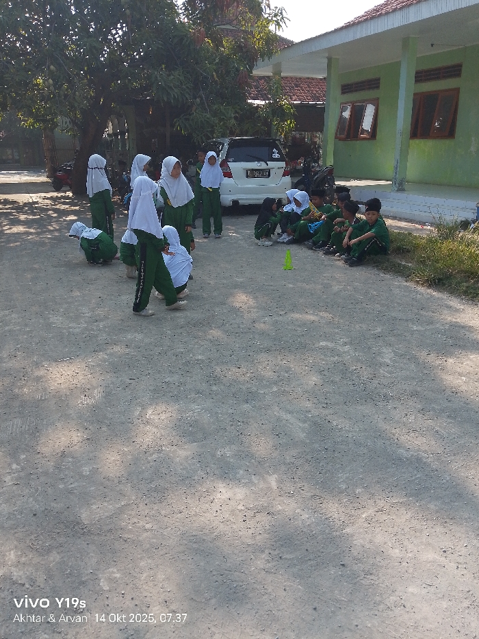 This outdoor scene, located in Jagapura Kidul, Indonesia, displays approximately twelve children, likely students, engaged in various activities under clear daylight. Six female individuals, dressed in identical green long-sleeved tops, green pants, and white hijabs, are positioned on the left and center of the frame; some are standing, while others are crouched or bending forward, indicative of active participation. To the right, five to six other students, similarly attired in green uniforms, are seated on the light grey, unpaved ground, directly adjacent to a single-story building. This building is light green with a red-tiled roof and features four brown-framed windows. A small, yellow-green cone is visible on the ground near the seated group. In the background, a white car with license plate F 3562 UY and a motorbike are parked beneath several large, leafy trees. The ground surface is granular, appearing as gravel or compacted dirt, with distinct shadows cast by the trees, indicating strong sunlight. Patches of dry grass are visible on the far right side of the frame.