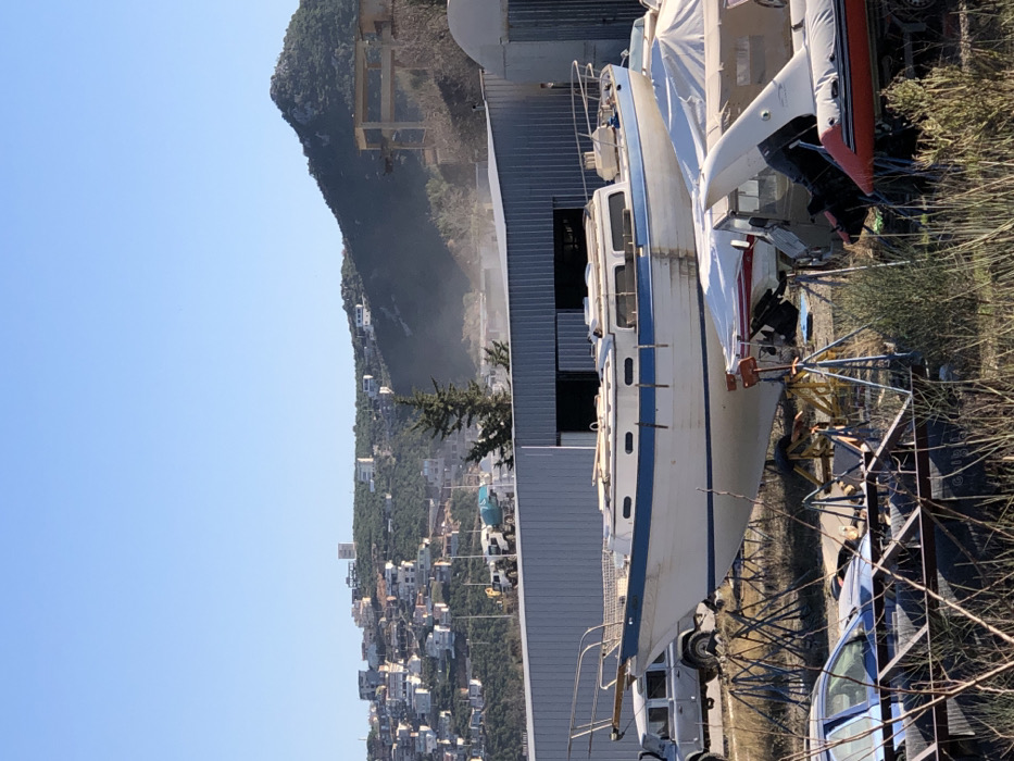 The image depicts an outdoor boat storage and repair area in Zaljevo, Montenegro, under a clear blue sky. In the immediate foreground, dry, sparse vegetation and a partially obscured blue vehicle are visible, alongside a black metal frame. Multiple boat stands, some yellow, are positioned among other smaller vessels, including a white boat with a red stripe covered by a white tarp, and an orange inflatable boat with a black outboard motor. The central subject is a white sailboat with a distinct blue stripe along its hull, currently resting on land, supported by several boat stands. The hull exhibits streaks of dirt or discoloration. Behind this sailboat, a light gray corrugated metal building with dark, open bays spans the midground. To the left of the sailboat, a silver SUV-type vehicle is parked. The background is dominated by a vegetated hillside densely populated with numerous white and light-colored residential structures, primarily on the left and central slopes. A tall, slender structure is visible on a distant hilltop amidst these buildings. On the right side of the hill, a multi-story, unfinished concrete structural frame is evident. A plume of light-colored dust or smoke rises from the base of the hill behind the metal building. Several vehicles, including a white dump truck and a blue concrete mixer truck, are discernible on a road at the base of the hill. No individuals are visible.
