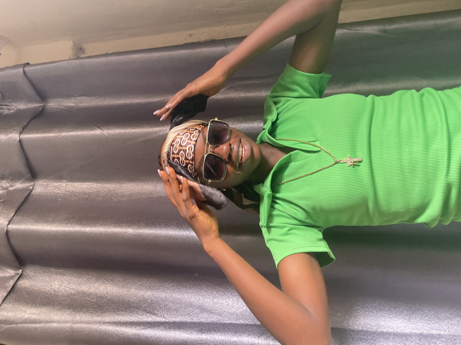 A woman is posing on her side, against a gray, metallic-looking backdrop. She's wearing a vibrant green, short-sleeved polo shirt and accessorized with a gold cross necklace and large, square sunglasses. A patterned headscarf adorns her head. She's facing the camera, her fingers touching her headscarf. The lighting highlights her skin tone.