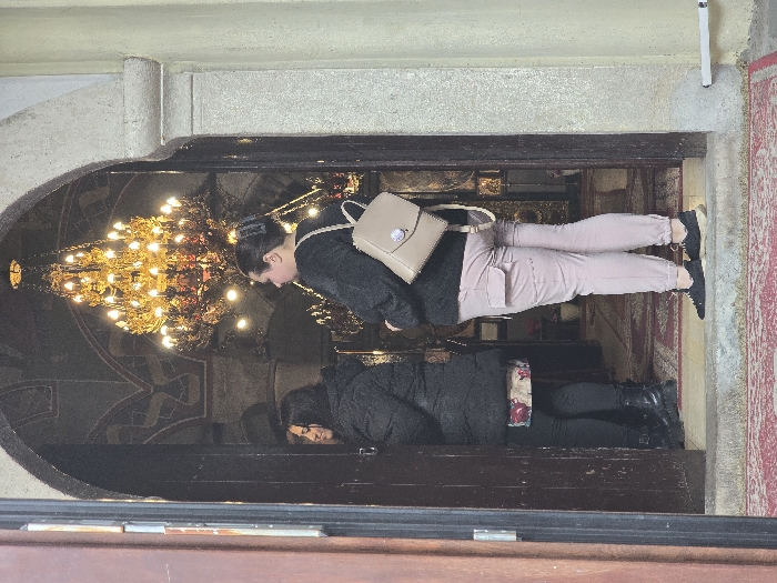 The image depicts the arched stone entrance to a religious building in Dryanovo, Bulgaria, likely Dryanovo Monastery "St. Michael the Archangel." Inside, a large, multi-tiered golden chandelier with numerous illuminated bulbs hangs from a vaulted ceiling adorned with dark-toned frescoes. A red patterned carpet extends from the exterior into the building's interior. Two females are present at the doorway. The woman closer to the viewer, positioned on the right, faces left, looking into the building. She wears a dark long-sleeved top, light pink cargo-style pants with elasticated cuffs, and black athletic shoes. Her dark hair is pulled back with a dark claw clip, and she carries a beige backpack with a distinctive purple or blue circular clasp detail on her right shoulder. The second woman is positioned further inside the doorway, on the left, partially obscured by an open dark wooden door and the first woman. She faces right, deeper into the building. She wears a black puffy winter coat, dark leggings, and black boots. A patterned garment with red, pink, and white floral motifs is visible beneath her coat. The exterior wall visible on the right is light-colored concrete, with a horizontal white pipe near its base.