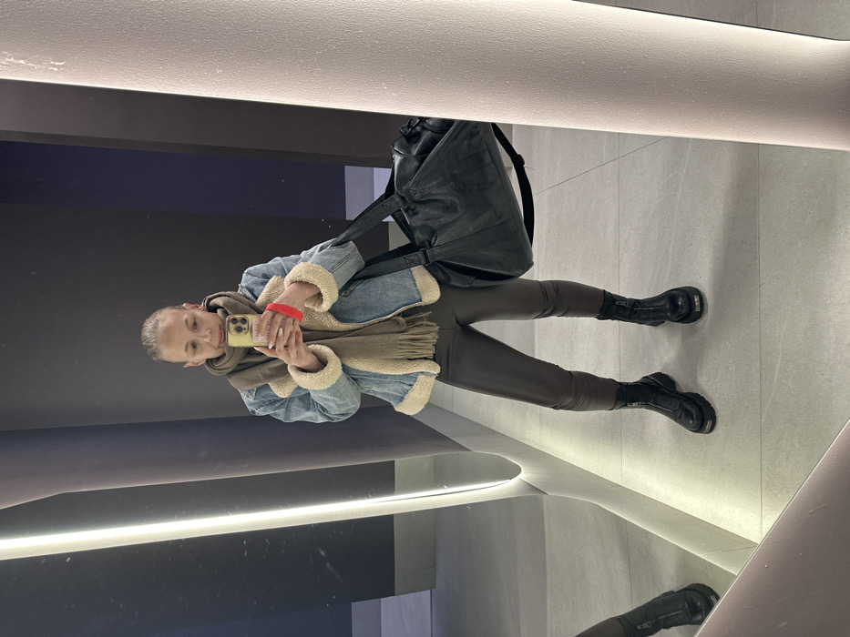 A woman stands in a modern bathroom, facing a mirror while holding a phone. She's wearing a denim jacket with a fleece lining, brown leggings, and black boots. A large, black backpack hangs over her shoulder. A light brown scarf is draped around her neck. The bathroom has light gray walls and flooring with a light strip running along the top.