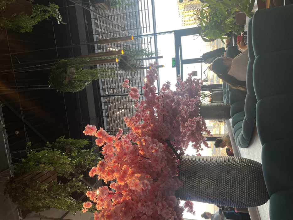 The image displays the interior of a contemporary establishment, likely a restaurant or cafe, located in Kommunarka, Russia. The space features large, floor-to-ceiling windows providing an expansive view of an urban landscape with distant buildings. Dominating the foreground and midground are multiple arrangements of artificial pink cherry blossoms, densely packed and illuminated with a warm light, held within textured, dark grey cylindrical vases. Several individuals are present within the establishment. In the foreground, a person with long dark hair, wearing a light-colored garment, is seated in a teal-colored, plush, semi-circular booth, facing away from the camera. This individual holds a small, red object. Further back, another person with shorter hair is partially visible in profile. On the far left, a person, possibly a server, stands near a table. The ceiling is dark and industrial in style, from which various green hanging plants in planters are suspended. Multiple cylindrical pendant lights with warm yellow glows are also suspended throughout the ceiling area. An illuminated green "EXIT" sign is visible above a glass door in the background, situated within the window structure. The external view suggests late afternoon or early evening lighting conditions.
