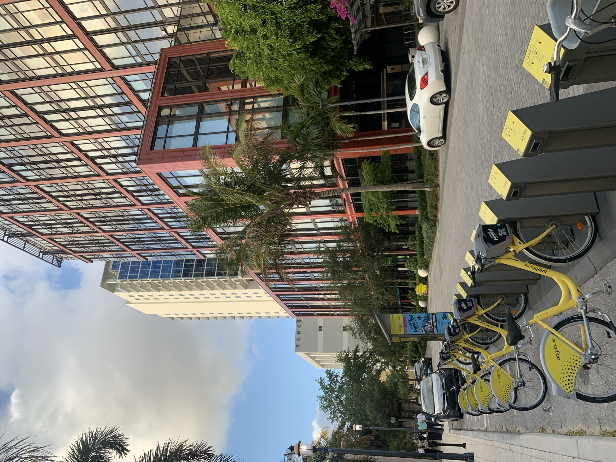 n urban scene in West Palm Beach, Florida, United States. A row of yellow "brightbike" rental bicycles is parked on a paved sidewalk. Behind the bicycles, a white car is parked along the street. The "brightbike" logo and branding are visible on the bicycles and their docking stations. Buildings of varying heights and architectural styles surround the scene. One building is characterized by a grid-like facade with a reddish-brown frame. Another building is a tall, white, high-rise structure. There are trees, including palm trees, dotting the landscape between the buildings. Signage is visible indicating "PARKI", "CENTER OF Paradise", and "MORE TO EXPLORE" alongside the "brightbike" advertising, suggesting a tourist-oriented area. The sky is partially cloudy, with patches of blue visible.
