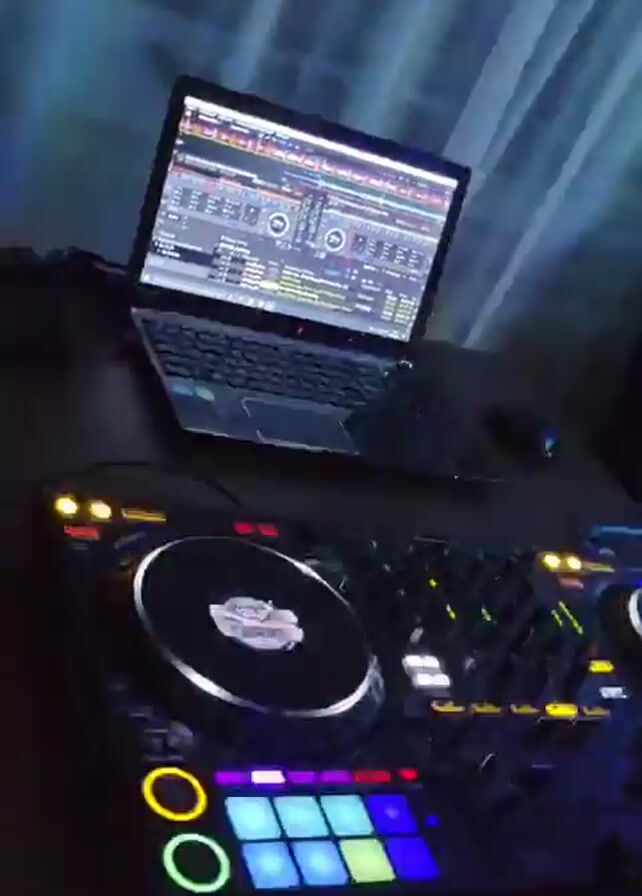 DJ setup in a room with changing colored lights