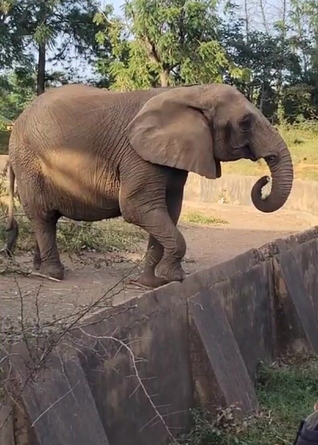 young elephant standing near a concrete barrier at a zoo. The elephant is brown, has large ears, and a curled trunk. It appears to be eating. There are trees in the background and a patch of grass behind the concrete barrier. A black bag is visible at the bottom right corner of the frame.